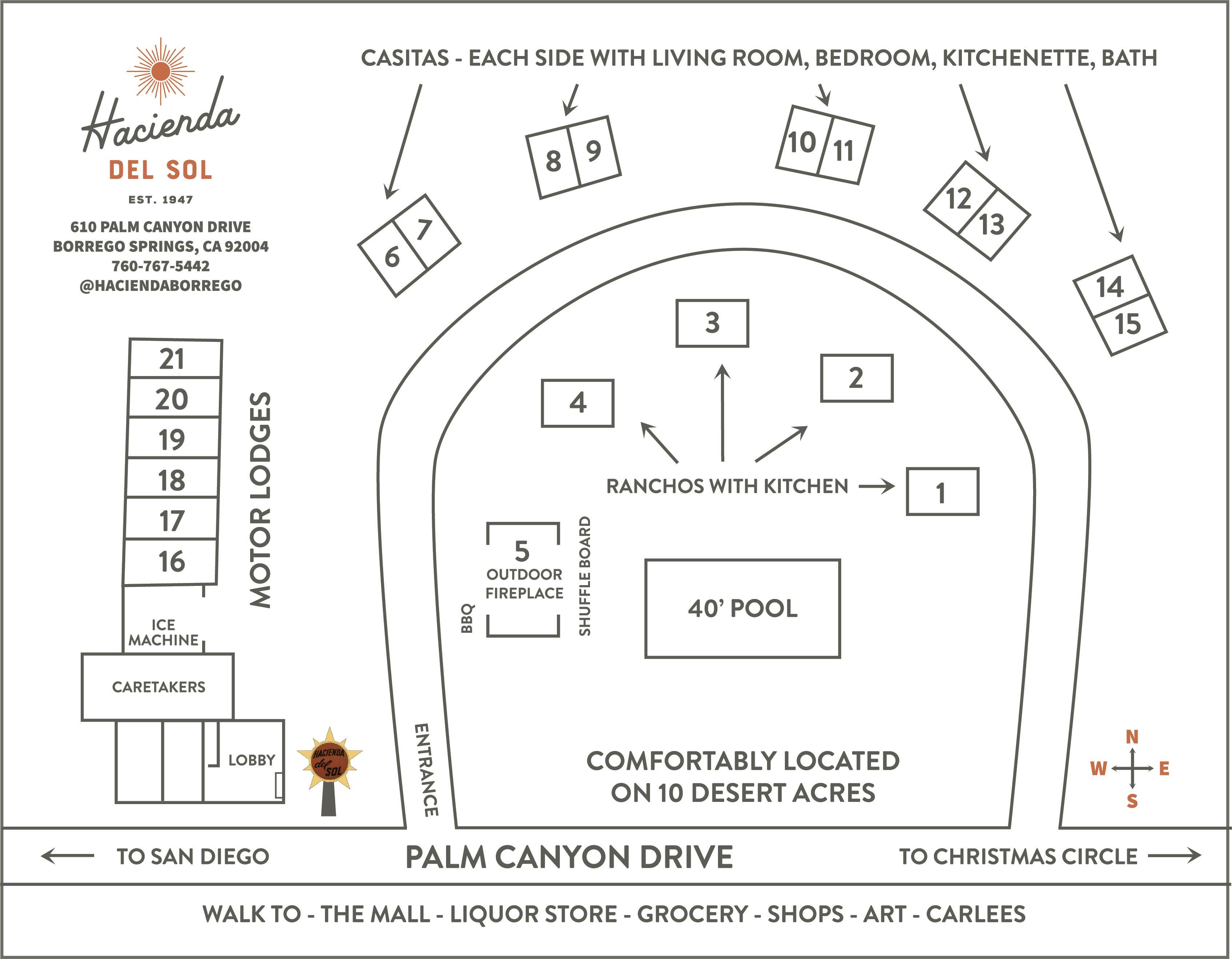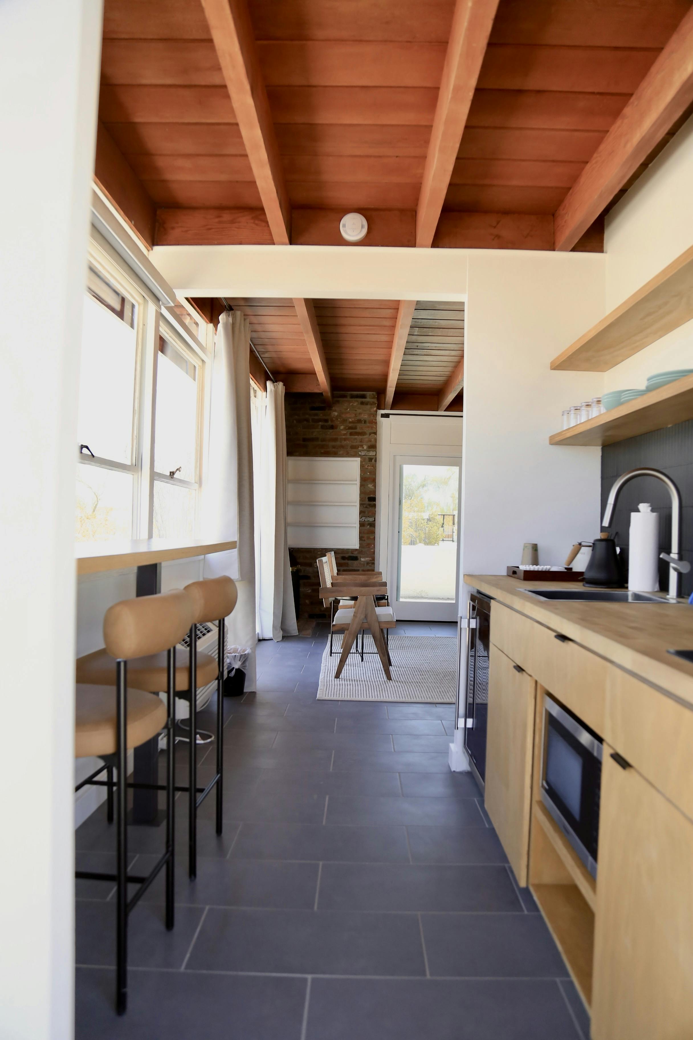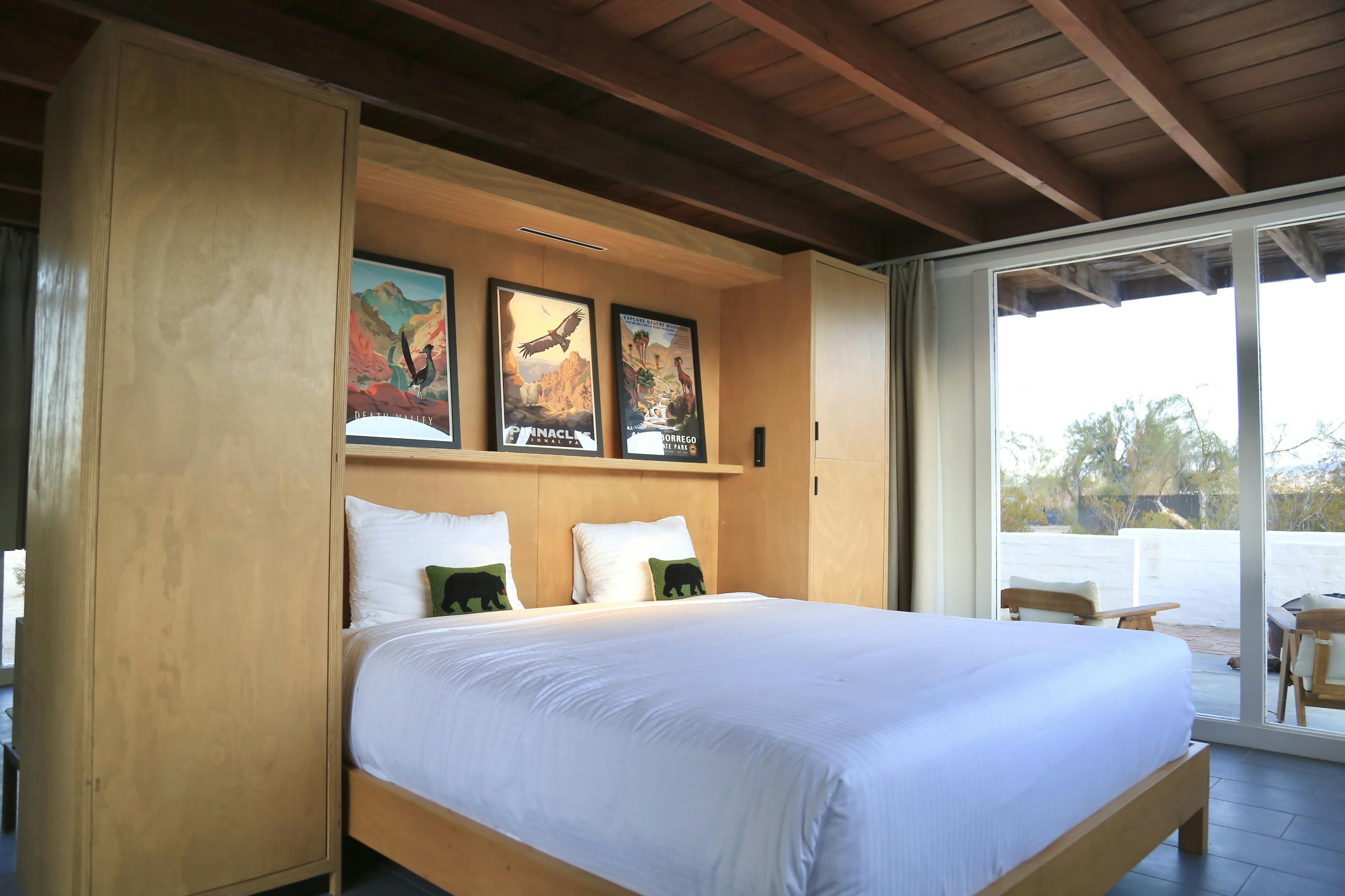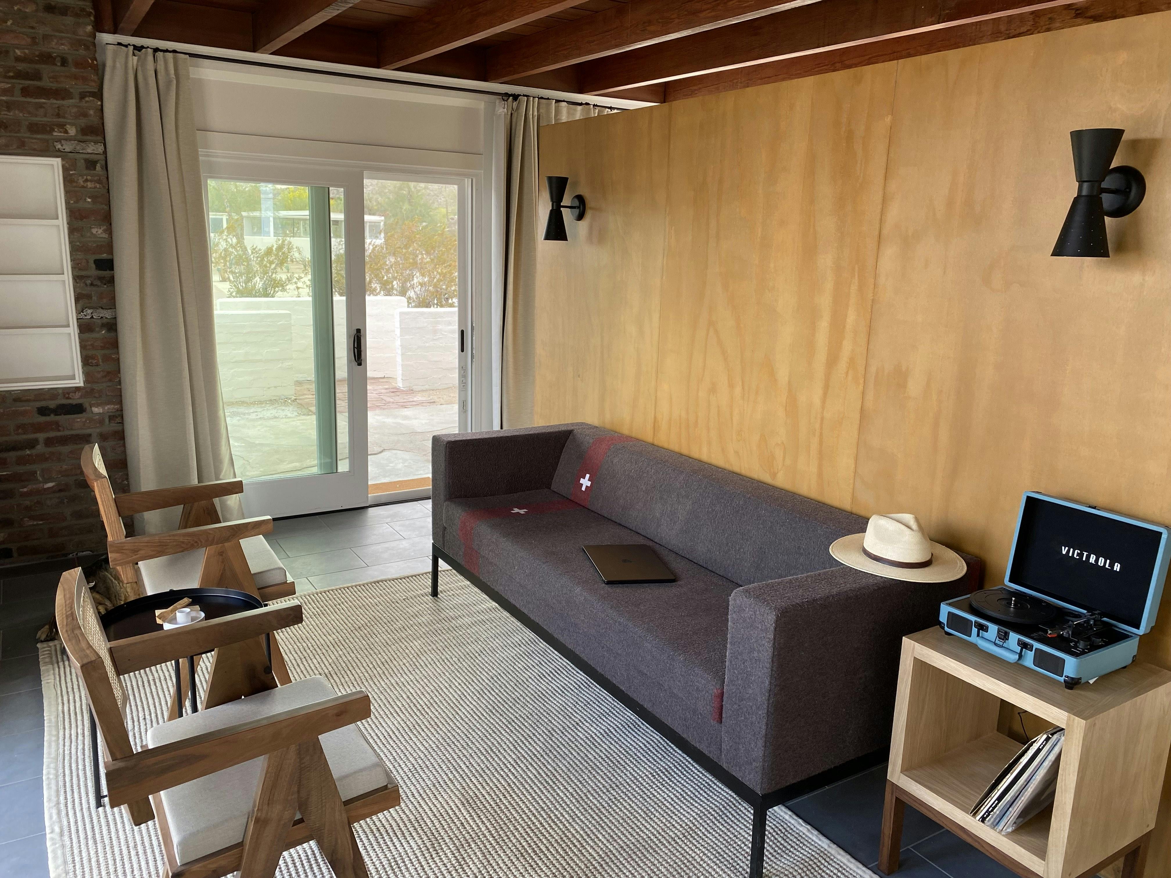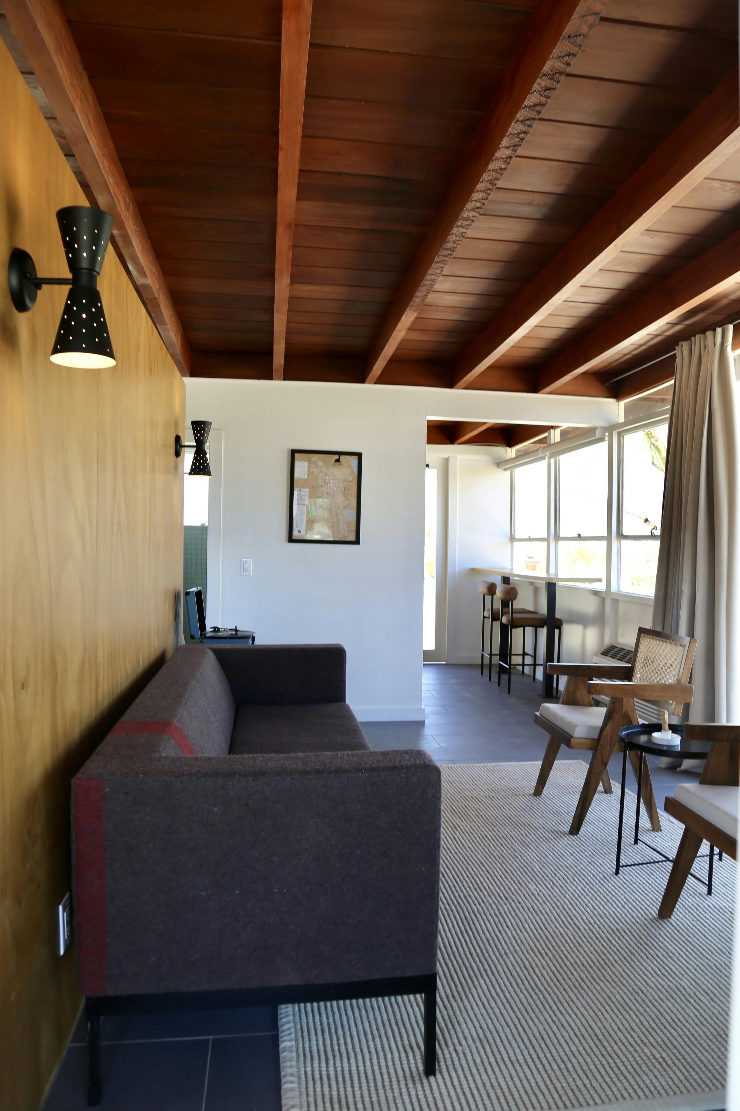 The Ranchos are a mid-century inspired, standalone studio-style unit designed for comfort and privacy. Inside, you’ll find a spacious open layout with a king bed and a cozy living area separated by a room divider.