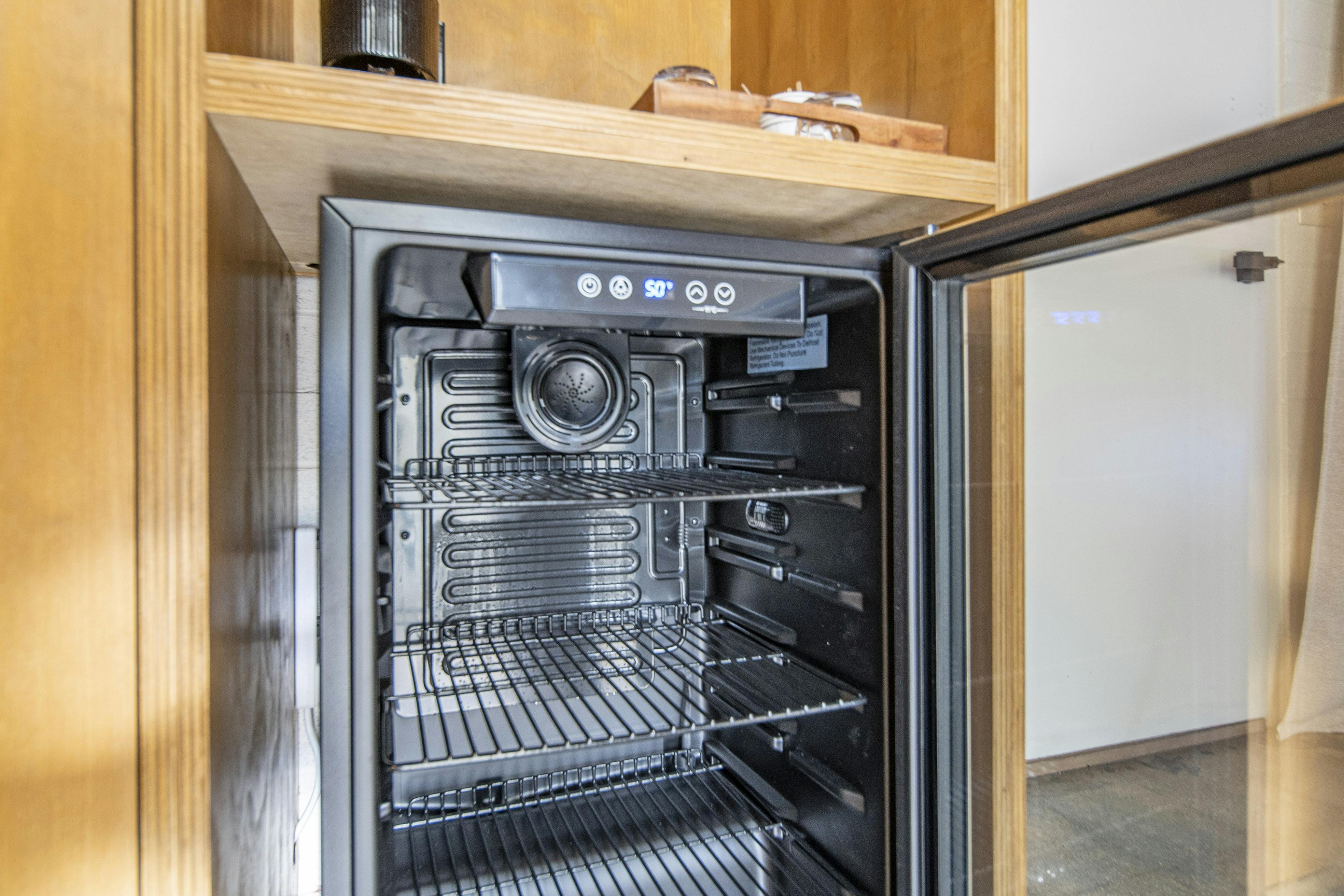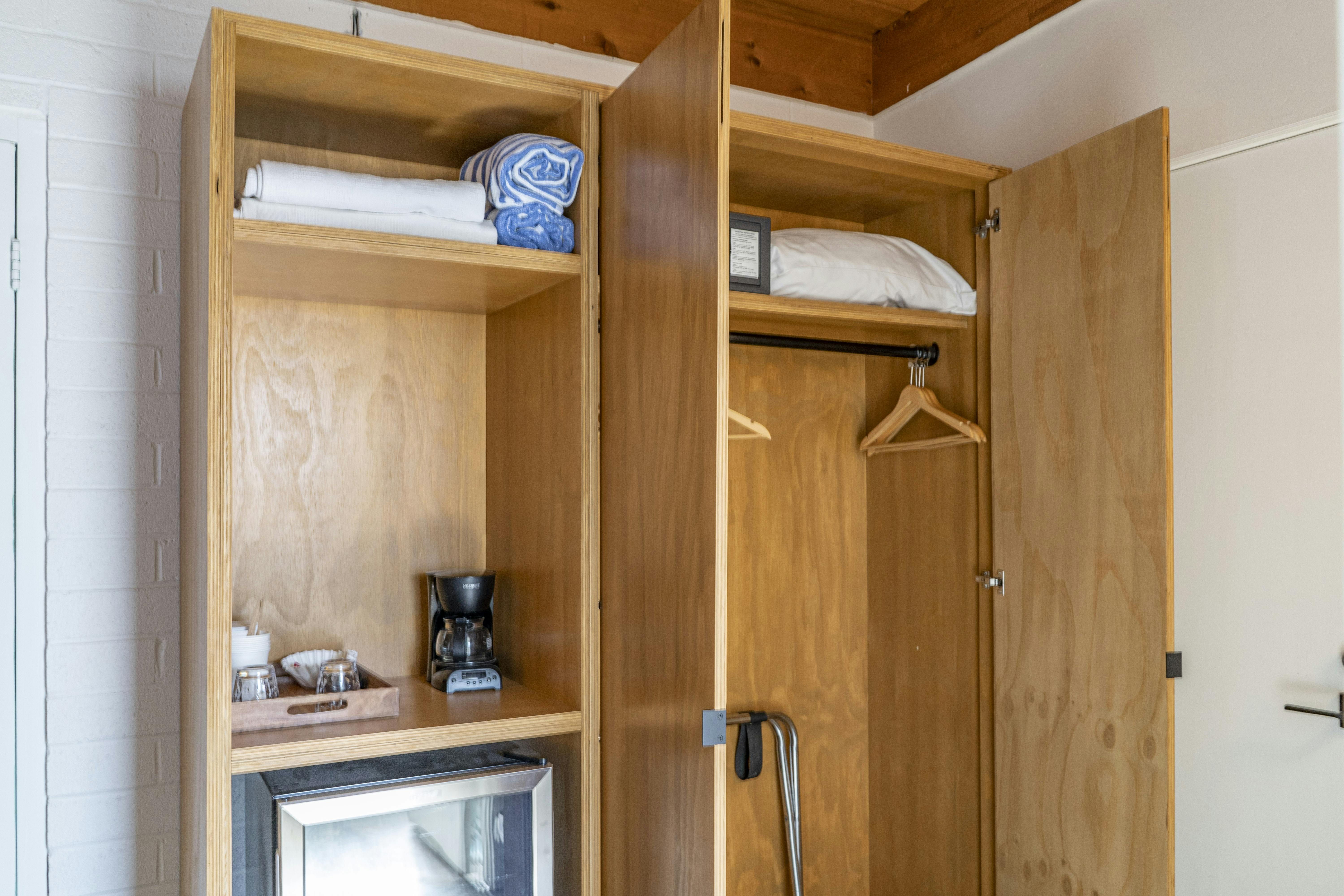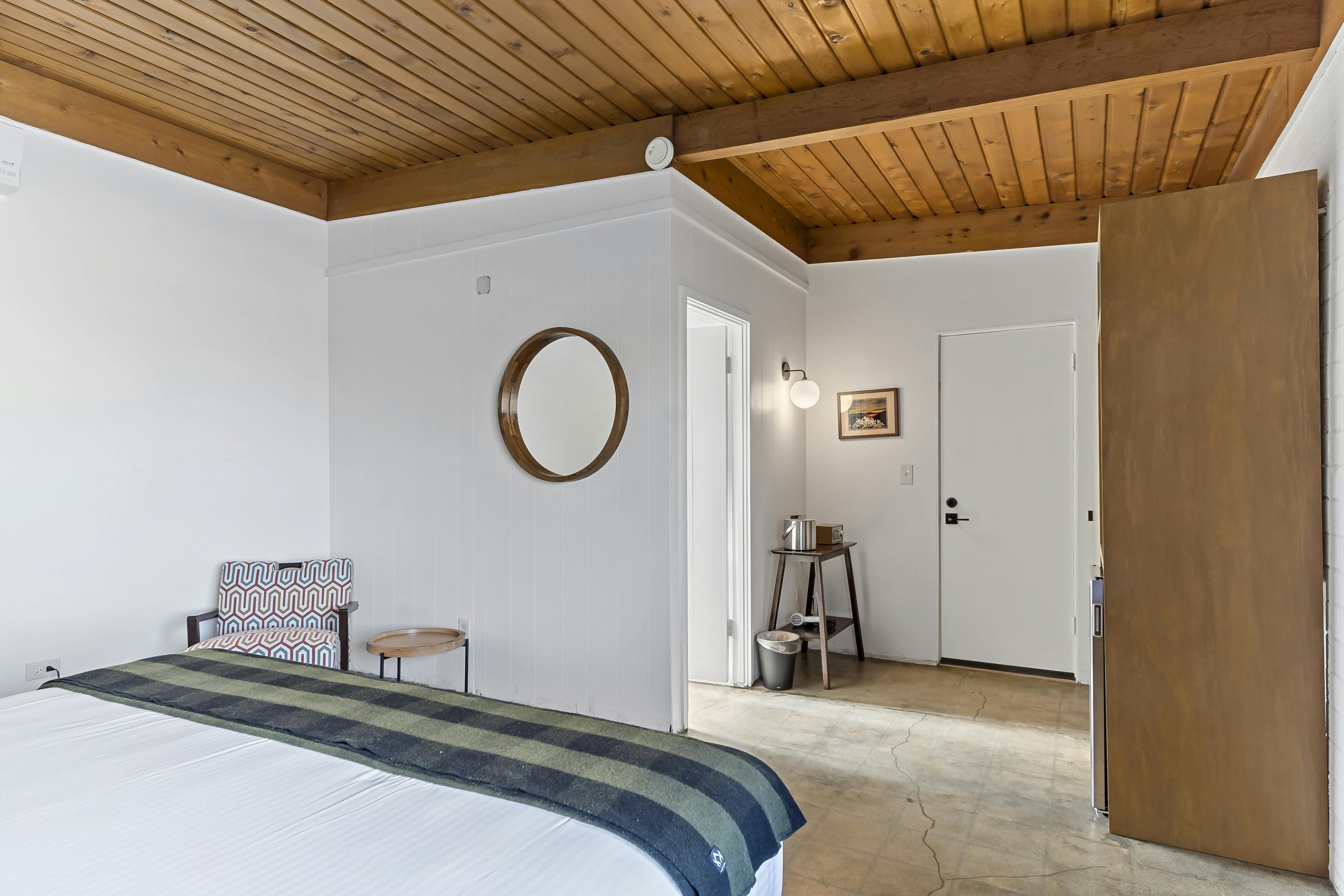 A standard studio motel room with a King Bed. Amenities include a WiFi/bluetooth speaker, mini fridge, and a coffee maker. Please note, there is NO TV or microwave.